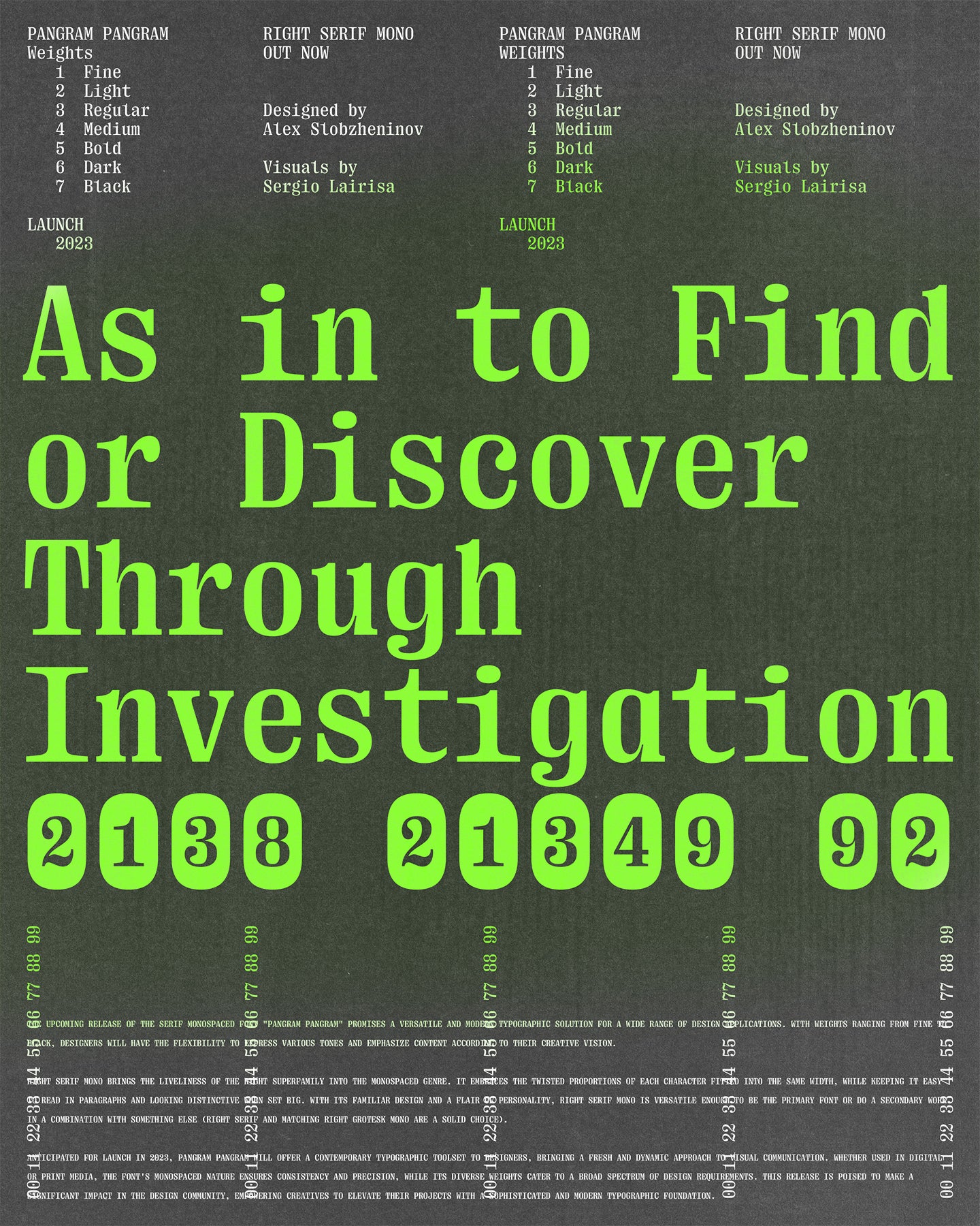 With its familiar design and a flair of personality, Right Serif Mono is versatile enough to be the primary font or do a secondary work in a combination with something else (Right Serif and matching Right Grotesk Mono are a solid choice).